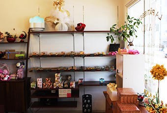 落ち着いた雰囲気のJR大久保駅から徒歩7分。道路沿いに白を基調とした、かわいらしい店構えの「 Pâtisserie A.MO」が見えてきます。店内は、お花が飾られたメルヘンな空間。動物をあしらったケーキやムースを使った丸いケーキなど、見た目もかわいいスイーツが並びます。